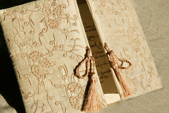 Old world luxury is the theme for this gold embroidered and beaded silk invitation folio. The invitation is meticulously hand calligraphed. The folio features gold tassel ties to complete the look.