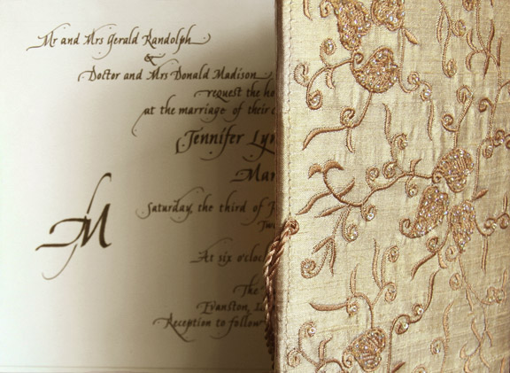 Old world luxury is the theme for this gold embroidered and beaded silk invitation folio. The invitation is meticulously hand calligraphed. The folio features gold tassel ties to complete the look.