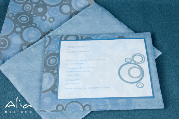 Modern circle design is silkscreened onto soft blue suede. The same graphic design carries through to     the invitation which is printed on light blue velvet paper and mounted on a suede cushioned board.