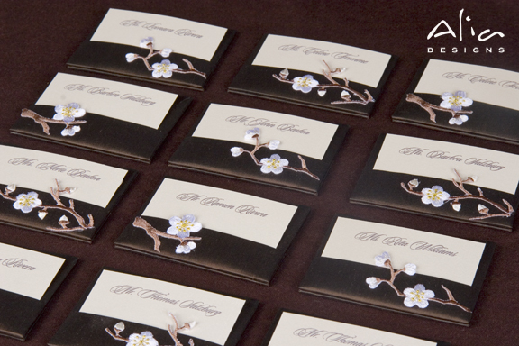 Vera Wang bridal fashion show luncheon at The Ritz-Carlton, Laguna Niguel: The menus and placecards featured a pearlized cardstock embroidered with branched flowers mounted on a thin cushion of silk.