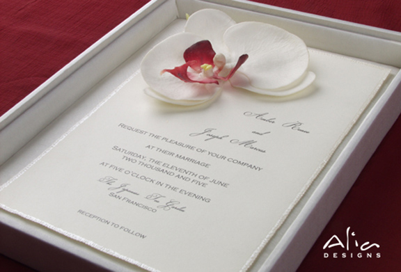 A white silk box houses this invitation adorned with a pure white orchid. The invitation sets the tone for