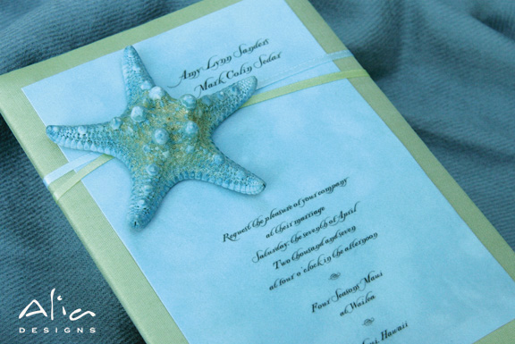 Sea blues and greens set the tone for this destination wedding. The invitation is printed on a texturized fabric paper and mounted on a cushioned silk board. A starfish and ribbon accent hint at the wedding colors.