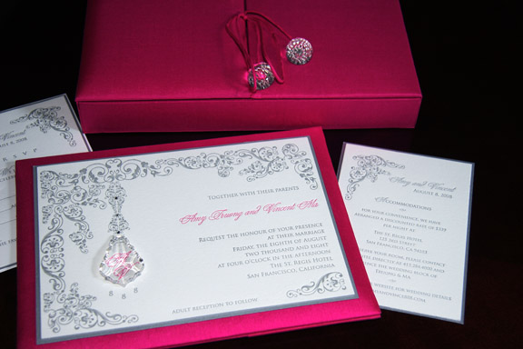 wedding which was featured on Platinum Weddings. A row of three Swarovski crystals trail down to a chandelier featuring the couple's custom monogram. The two color letterpressed invitation is housed inside a custom silk invitation box.