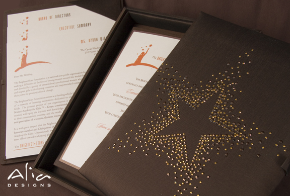 Copper and bronze stones are inlayed on a chocolate silk box creating a rippling star effect as a prelude   for this Brightest Stars Foundation invitation to join the Executive Advisory Board.