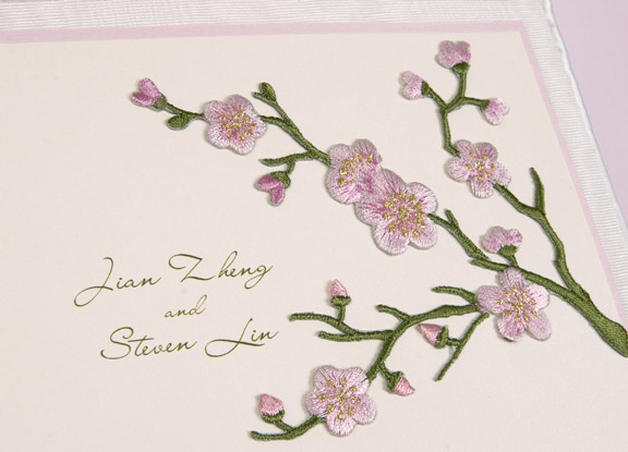 An embroidered sakura design gives a three dimensional feel to Jian and Steven's elegant invitation.