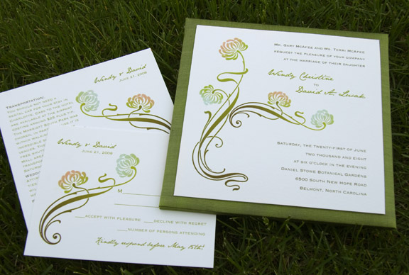 Art nouveau graphics befit this garden wedding for a modern bride and groom.